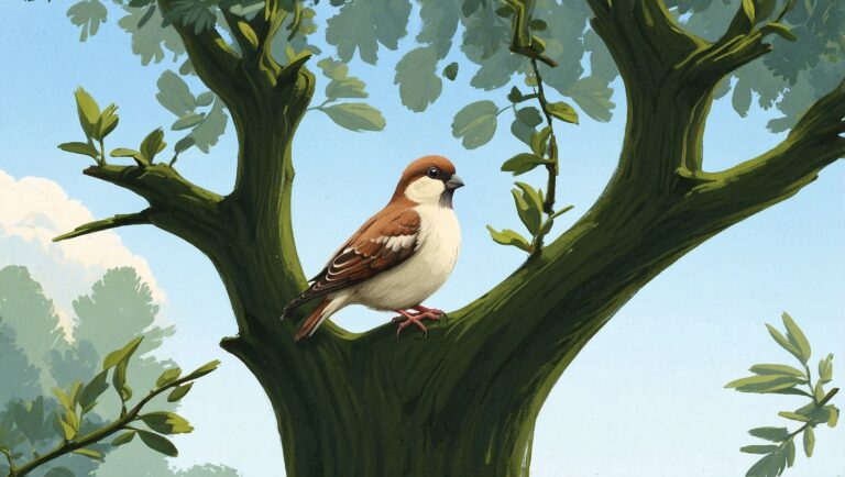 In a bright green forest lived a tiny sparrow named Chirpy.