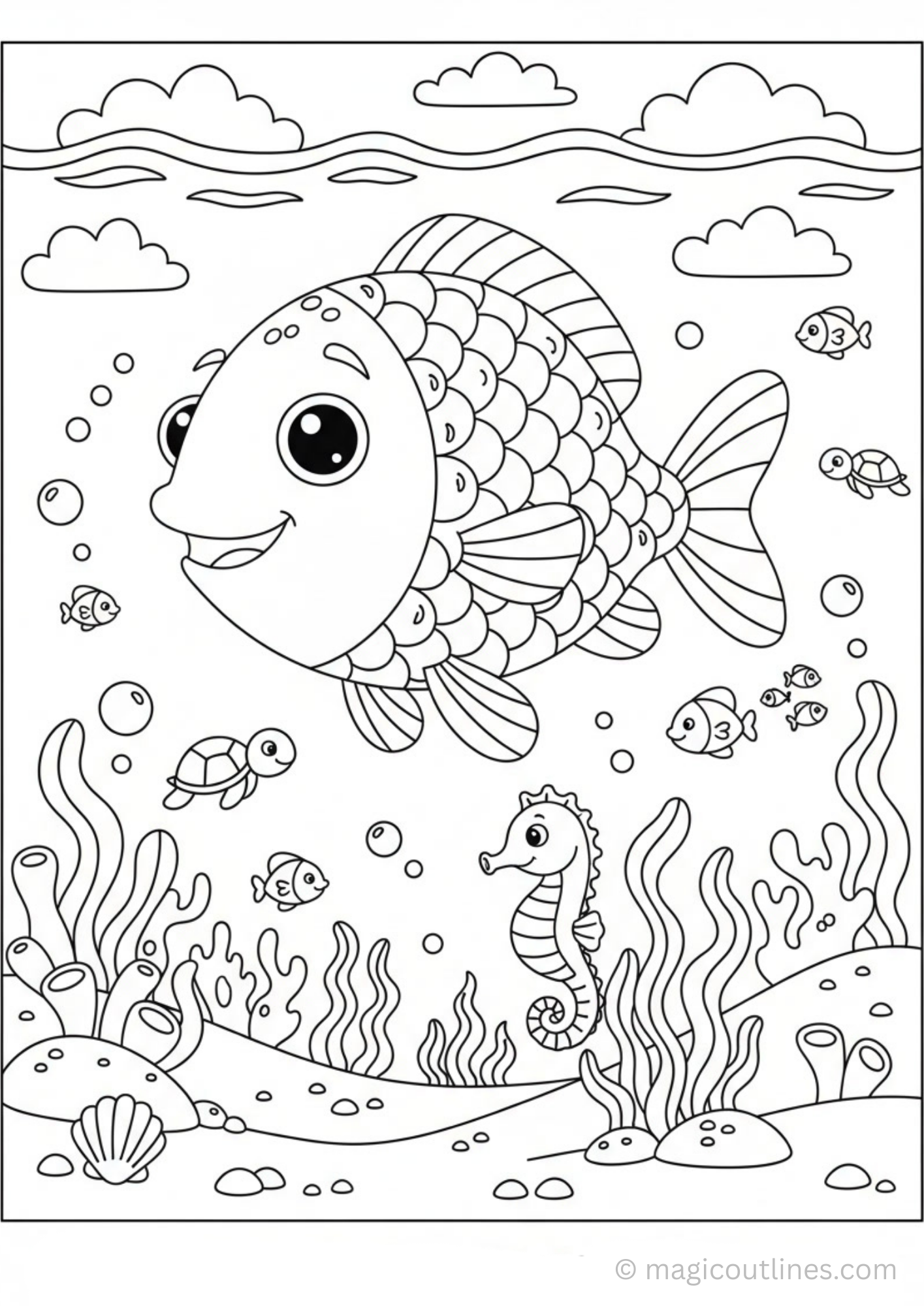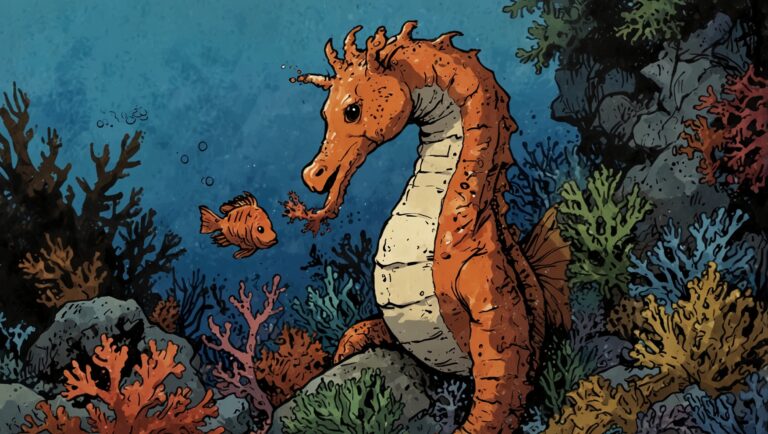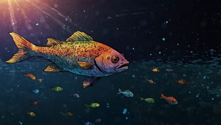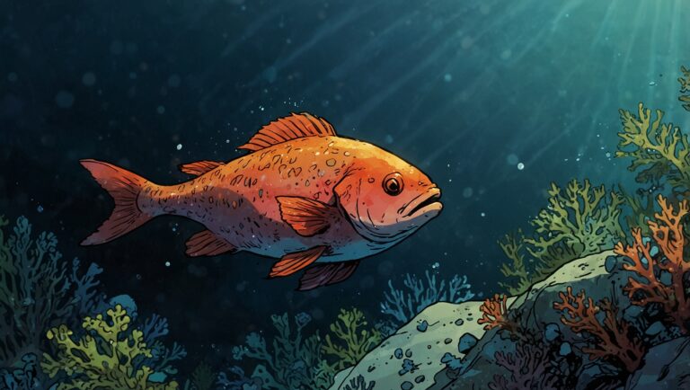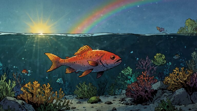 In the deep blue ocean, there lived a beautiful little fish named Coral. She had scales that sparkled like tiny rainbows, with every color you could imagine—red, orange, yellow, green, blue, and purple.