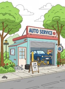 Bring the excitement of a real auto service station to life with this detailed free coloring page, optimized for A4 printing. Featuring an open garage bay with a red car on a lift, mechanic tools, hanging tires, a “CAR REPAIR” sign, and lush trees against a city skyline, this black-and-white illustration sparks imagination in young artists.