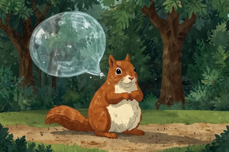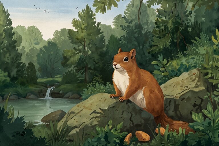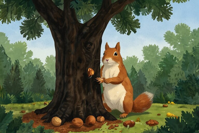 “Once there was a busy little squirrel named Nutty who lived in a big oak tree. Every day, Nutty scampered around collecting acorns, walnuts, and shiny chestnuts. ‘I need MORE nuts!’ he chattered. Nutty built a giant pile under his tree—taller than Rabbit’s burrow!”