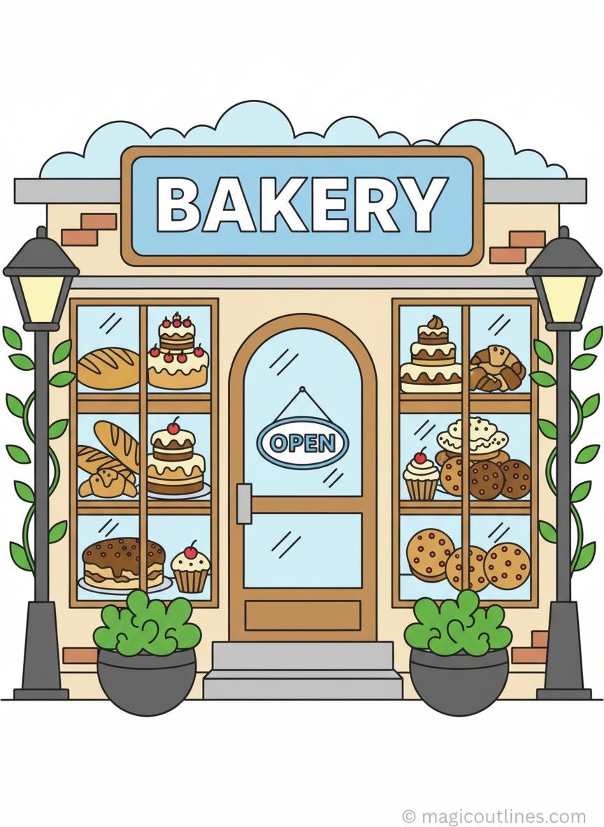 This Bakery Shop Coloring Page introduces kids to a friendly and familiar community place—the bakery. The illustration shows a cheerful bakery shop with a display of bread, cakes, and pastries, designed using bold outlines and open spaces for easy coloring.