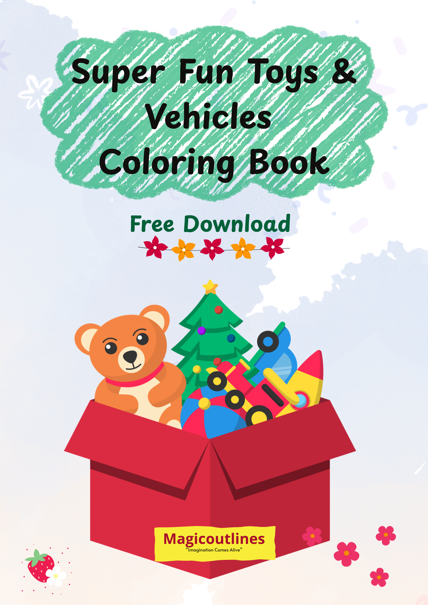 Download a fun toys and vehicles coloring book for kids featuring cute toy cars, trains, rockets, dolls, and fantasy scenes.…