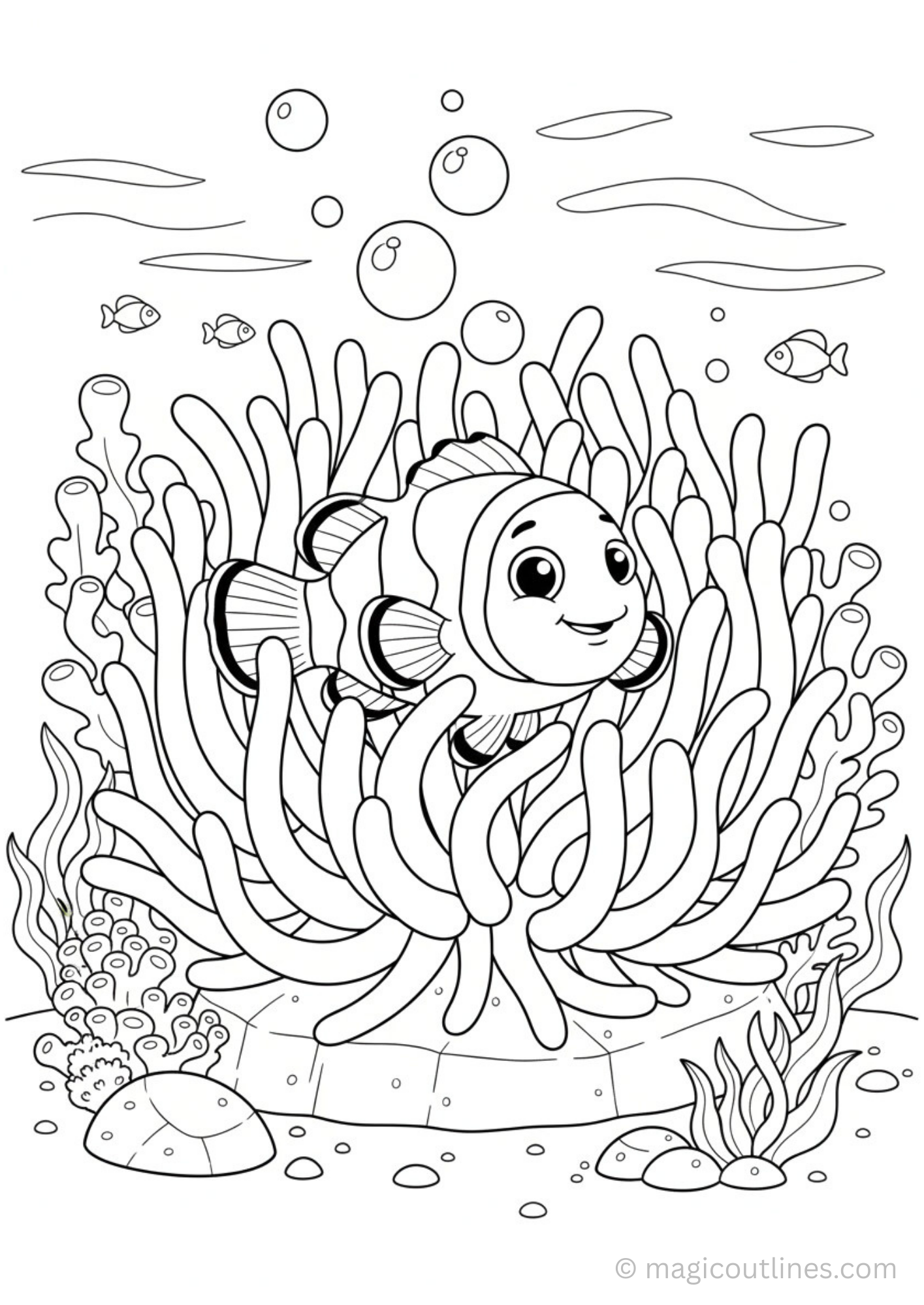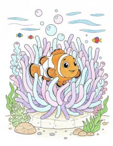 This Clownfish in Anemone Coloring Page is a free printable activity designed to introduce children to ocean life in a fun and creative way. The illustration shows a friendly clownfish safely swimming inside a sea anemone, surrounded by gentle underwater details that make coloring enjoyable and relaxing for kids.
