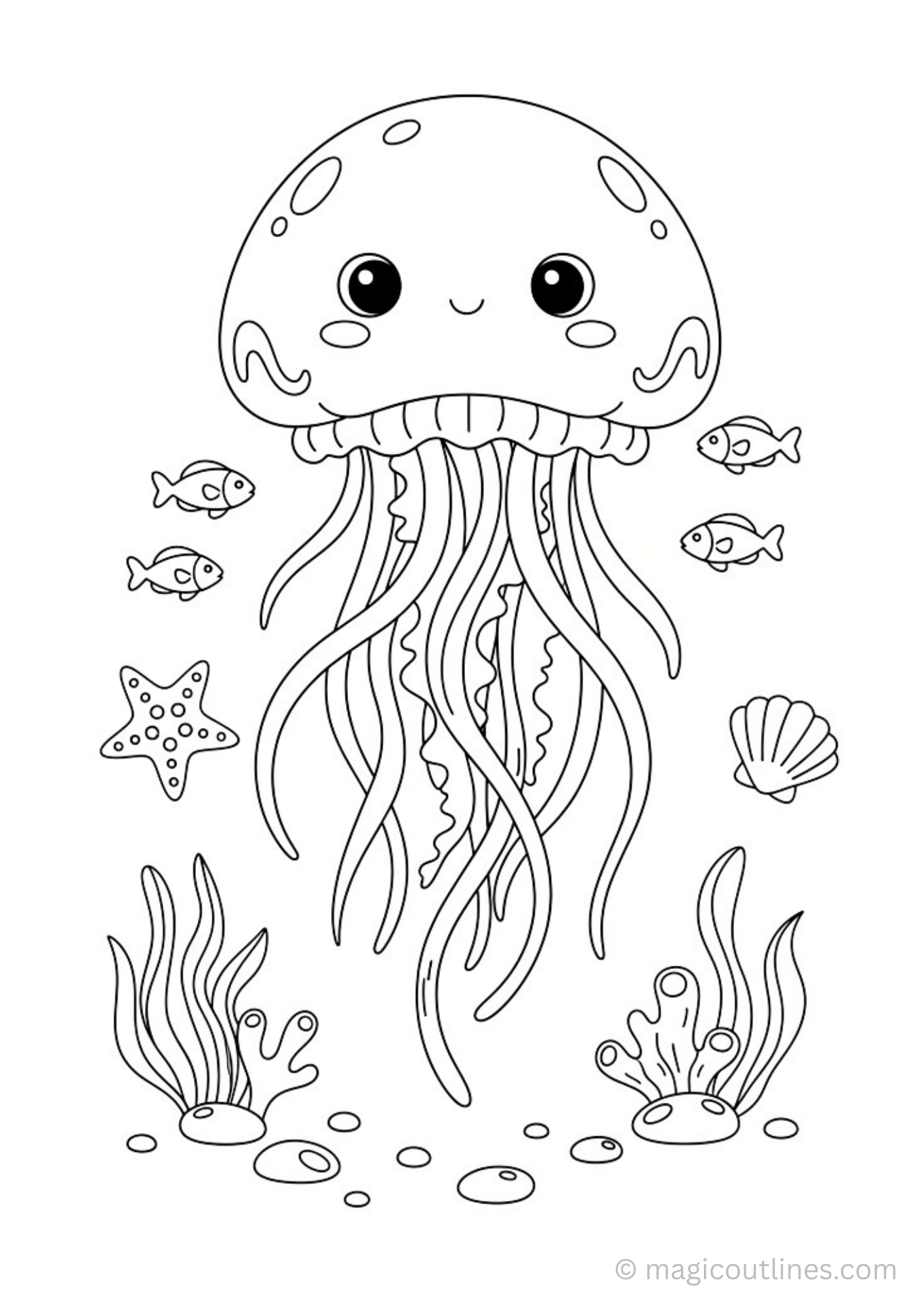 Download this cute jellyfish coloring page for kids, featuring a smiling jellyfish floating gently underwater. The illustration includes friendly fish, a small starfish, seashells, soft coral plants, seaweed, and smooth pebbles on the ocean floor, creating a calm and playful marine scene.