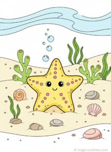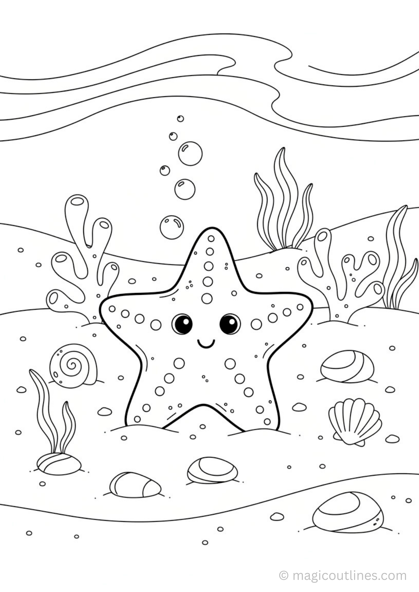 Download this cute starfish coloring page for kids, designed in a calm underwater ocean theme. The smiling starfish rests on the sandy seabed, surrounded by simple seashells, smooth pebbles, soft coral plants, gentle seaweed, and floating bubbles.