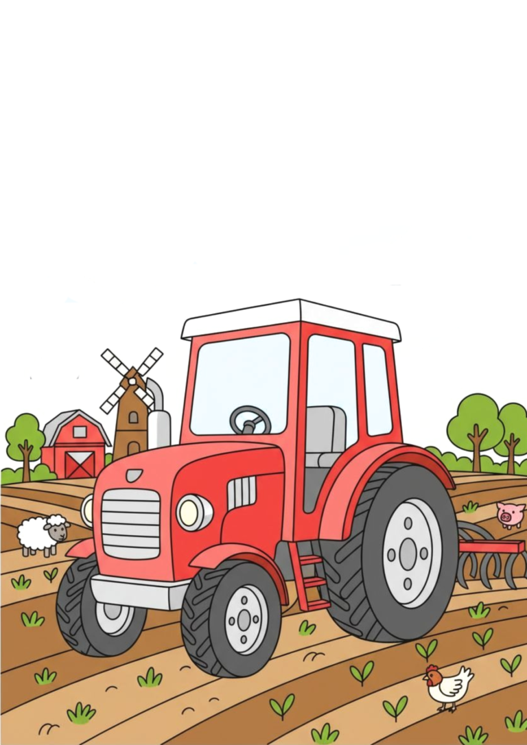 A farm tractor is an important machine used by farmers to plow fields, plant seeds, and harvest crops. It helps make farming easier and faster. This printable introduces kids to agricultural life and helps them understand how food is grown.