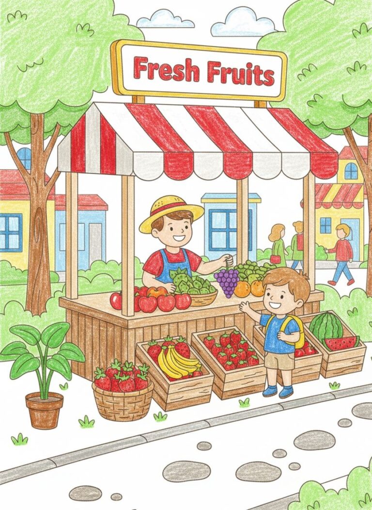 Coloring activities also allow kids to experiment with different color combinations. They can decorate fruit baskets, vendor carts, and shop signs with creative patterns and bright colors.