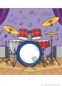 This Full Drum Set Coloring Page Printable PDF is a fun and engaging activity designed especially for children who love music and musical instruments. The coloring page features a complete drum kit, including a bass drum, snare drum, toms, cymbals, and drumsticks, all illustrated in a clean and easy-to-color outline style.