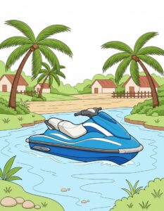 This jet ski coloring page features a sleek water scooter gently resting on flowing water, set in a peaceful tropical environment with palm trees, plants, grassy banks, and small village houses in the background. The illustration is designed in clean black-and-white line art with dark, bold outlines, making it easy for children to color neatly. The soft 3D-style perspective adds depth while keeping the design simple and kid-friendly. This printable coloring page helps children explore water vehicles and outdoor scenes, improves focus and hand-eye coordination, and encourages creativity through nature-inspired coloring. Ideal for A4 printing, it’s perfect for home activities, classrooms, summer worksheets, or travel-themed coloring fun.
