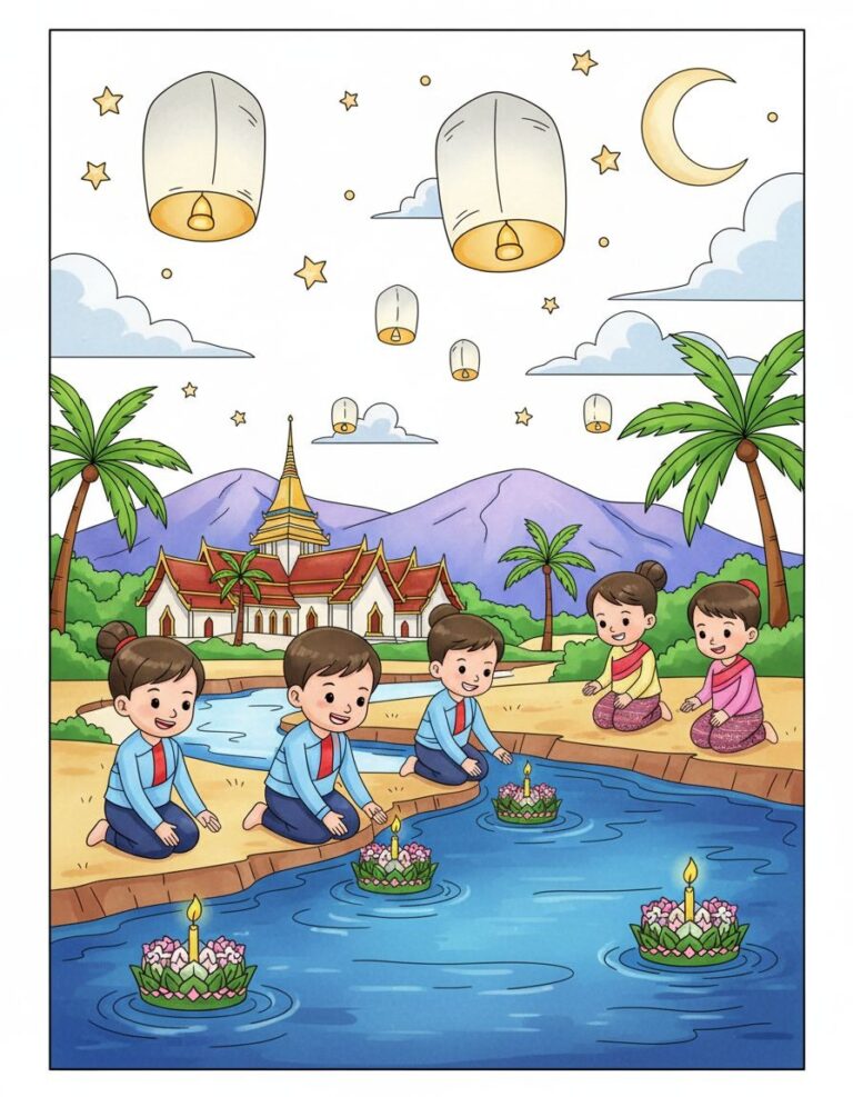 This Loy Krathong coloring page is a beautiful and peaceful printable activity inspired by one of the most magical festivals in Thailand. Children can enjoy coloring a night scene where glowing lanterns float in the sky and decorated krathongs gently move on the water.