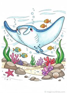 This Manta Ray Coloring Page is a free printable activity designed to introduce children to the beauty of ocean life in a fun and relaxing way. The illustration features a gentle manta ray gliding gracefully through the water, surrounded by simple coral, sea plants, and ocean floor details. The clean, bold outlines and large open spaces make this page easy and enjoyable for kids to color.