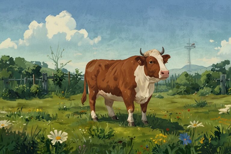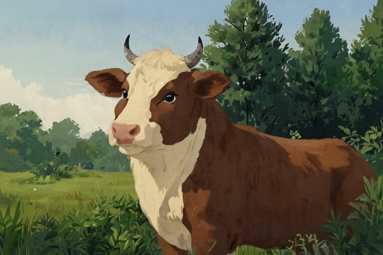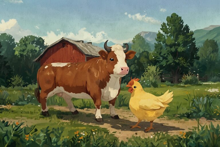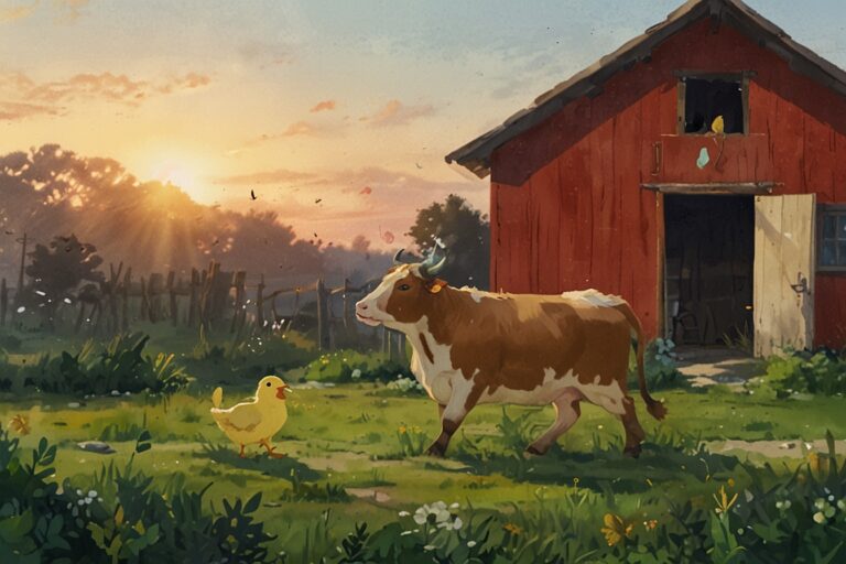 Once upon a time, on a sunny farm, there lived a gentle cow named Daisy. Daisy had soft brown spots and loved munching on green grass under the big blue sky.