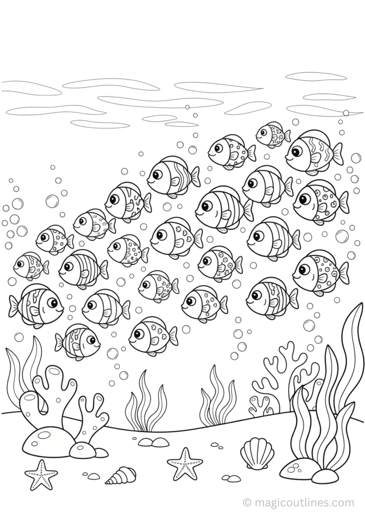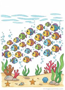 This School of Small Fish coloring page printable in A4 size features a cheerful underwater scene filled with many small fish swimming together in a group. Designed with bold, clean outlines, this coloring page is easy to print and perfect for young children to color comfortably.