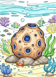 This Sea Sponge Coloring Page is a free printable worksheet designed to introduce children to fascinating ocean life in a fun and creative way. The illustration shows a sea sponge growing naturally on the ocean floor, surrounded by gentle sea plants, rocks, coral shapes, and small fish, all drawn with clean and bold outlines for easy coloring.