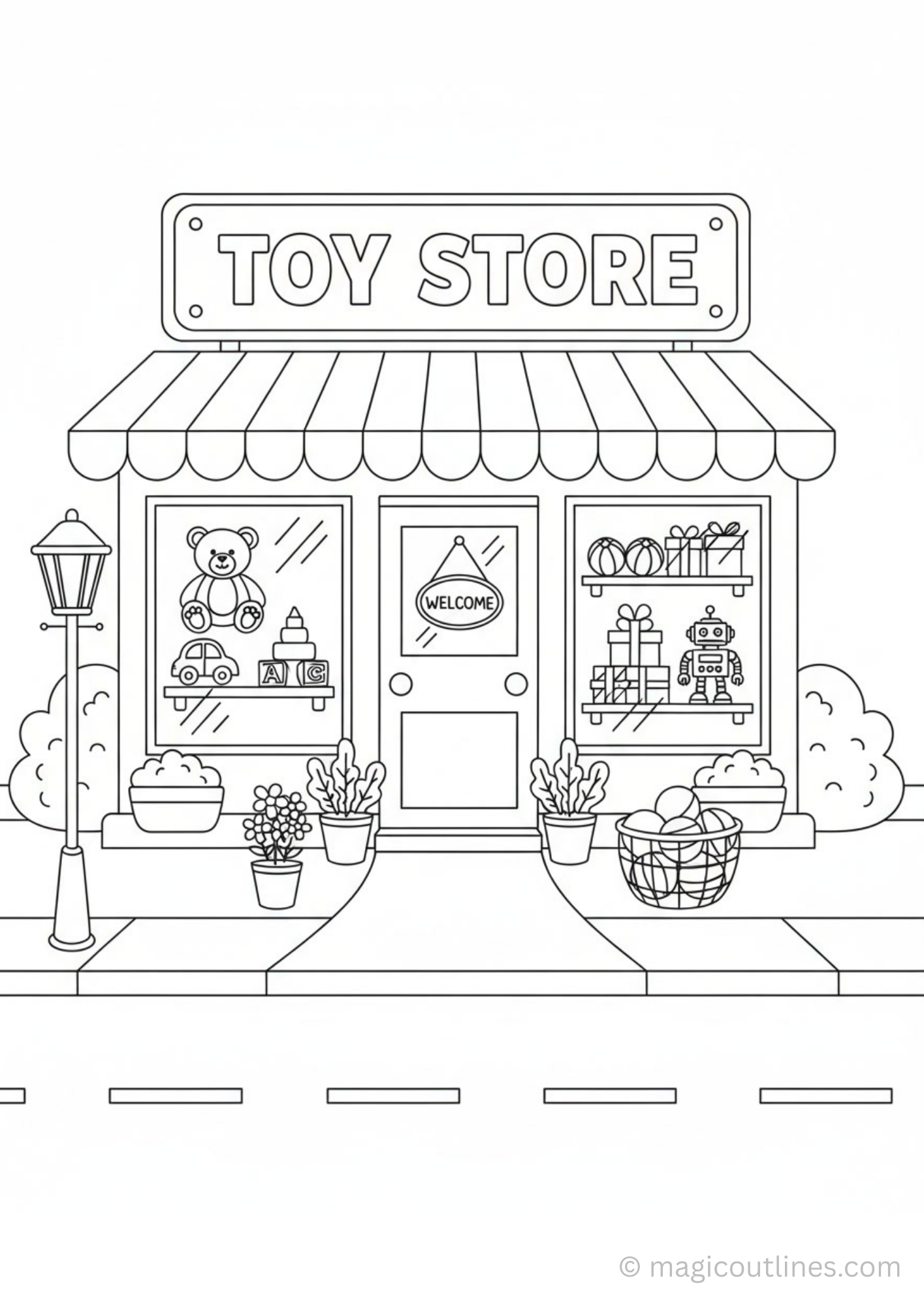 🧸Toy Store Building Coloring Page for Kids – Free Printable Shop Coloring Sheet