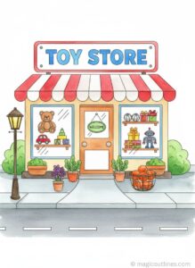 Let your child’s imagination come to life with this adorable Toy Store coloring page designed especially for young learners and creative minds. This printable coloring sheet features a beautifully illustrated toy shop building with large display windows showcasing toys like teddy bears, gift boxes, toy cars, and fun play items that children love.